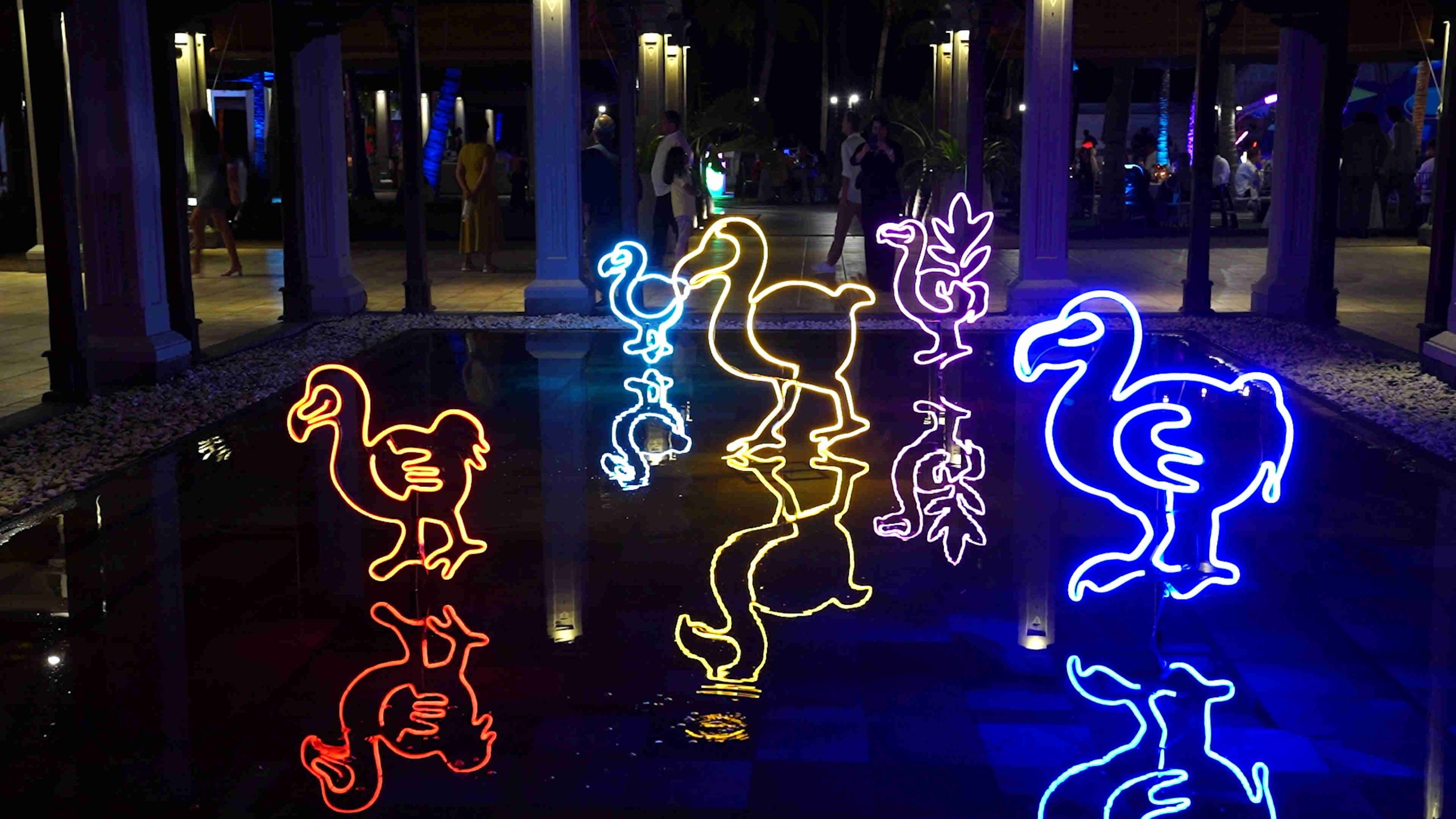Along the water’s edge stood a series of illuminated Dodo sculptures, outlined in vibrant LED, bold yet refined.