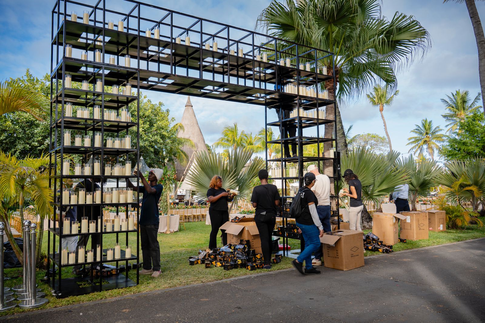 - Modular grid bays that hold hundreds of warm LED candles in glass sleeves