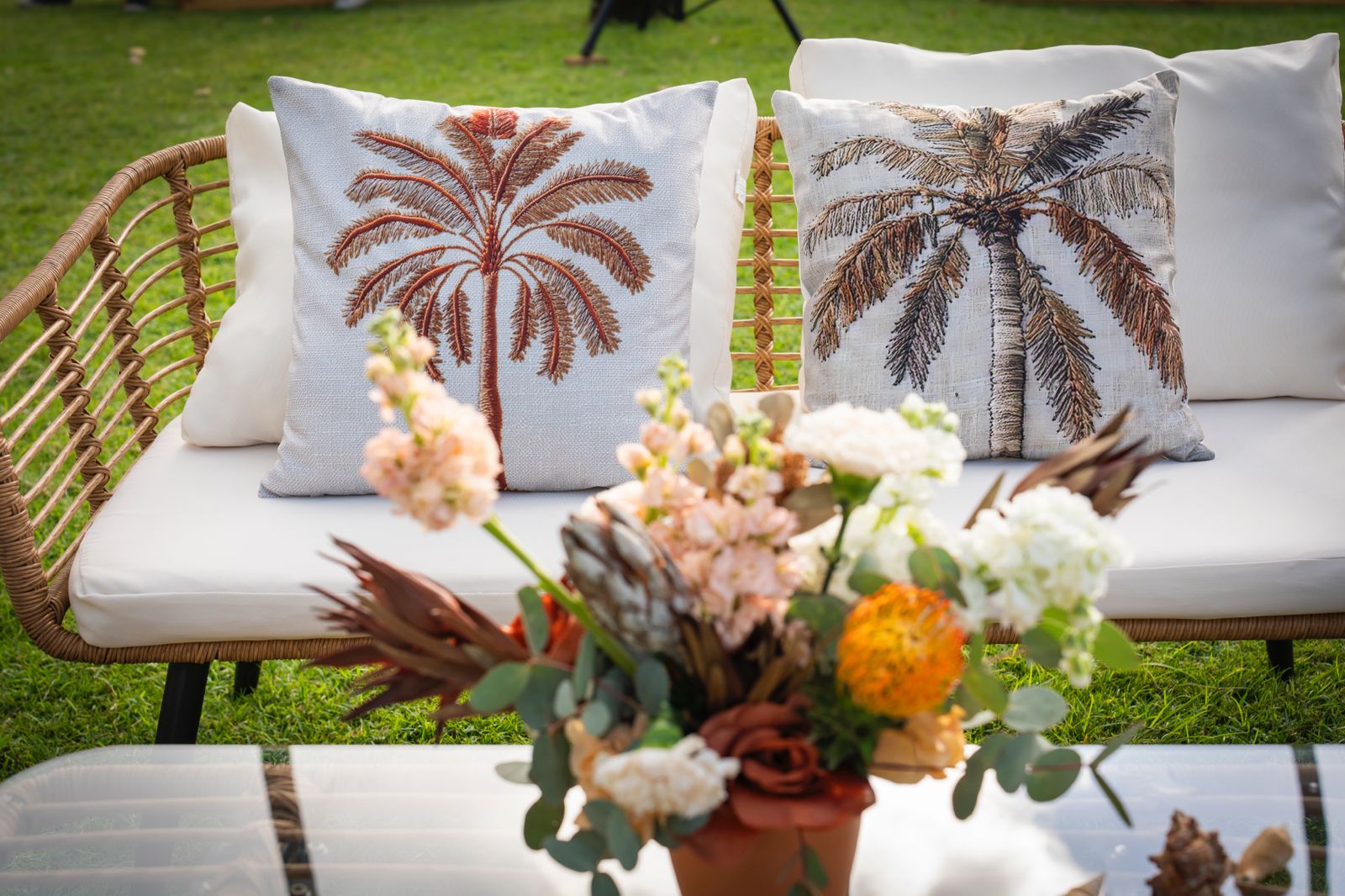 Wooden tables, bamboo lounge elements, terracotta vases, rattan lampshades, dried florals, and pampas grass subtle but rich impact.
